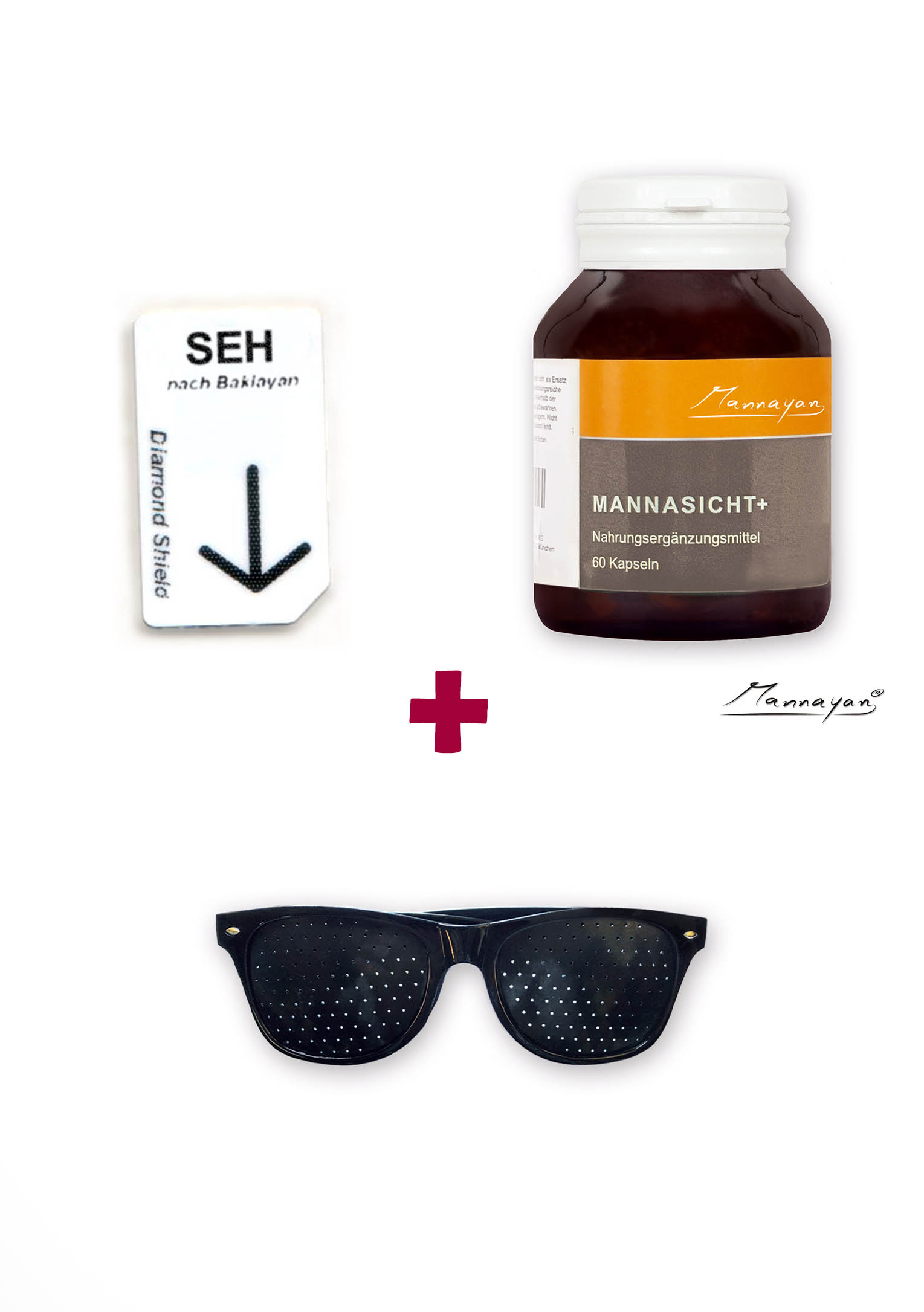 Die Chipcard SEH für den Diamond Shield Zapper zusammen mit dem beliebten Mannayan Mannasicht+ und unserem neuen Augentrainer: der Lochrasterbrille (erhältlich in drei verschiedenen Modellen).