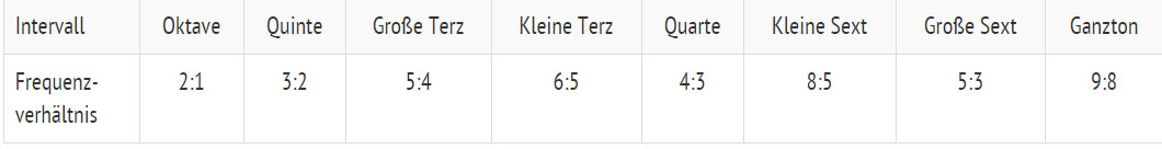 De verhouding van 1 op ½ staat voor een verdubbeling van de frequentie en dus voor dezelfde noot van het volgende octaaf. Deze wiskundige verhouding is gelijkelijk van toepassing op alle resterende noten van een octaaf.